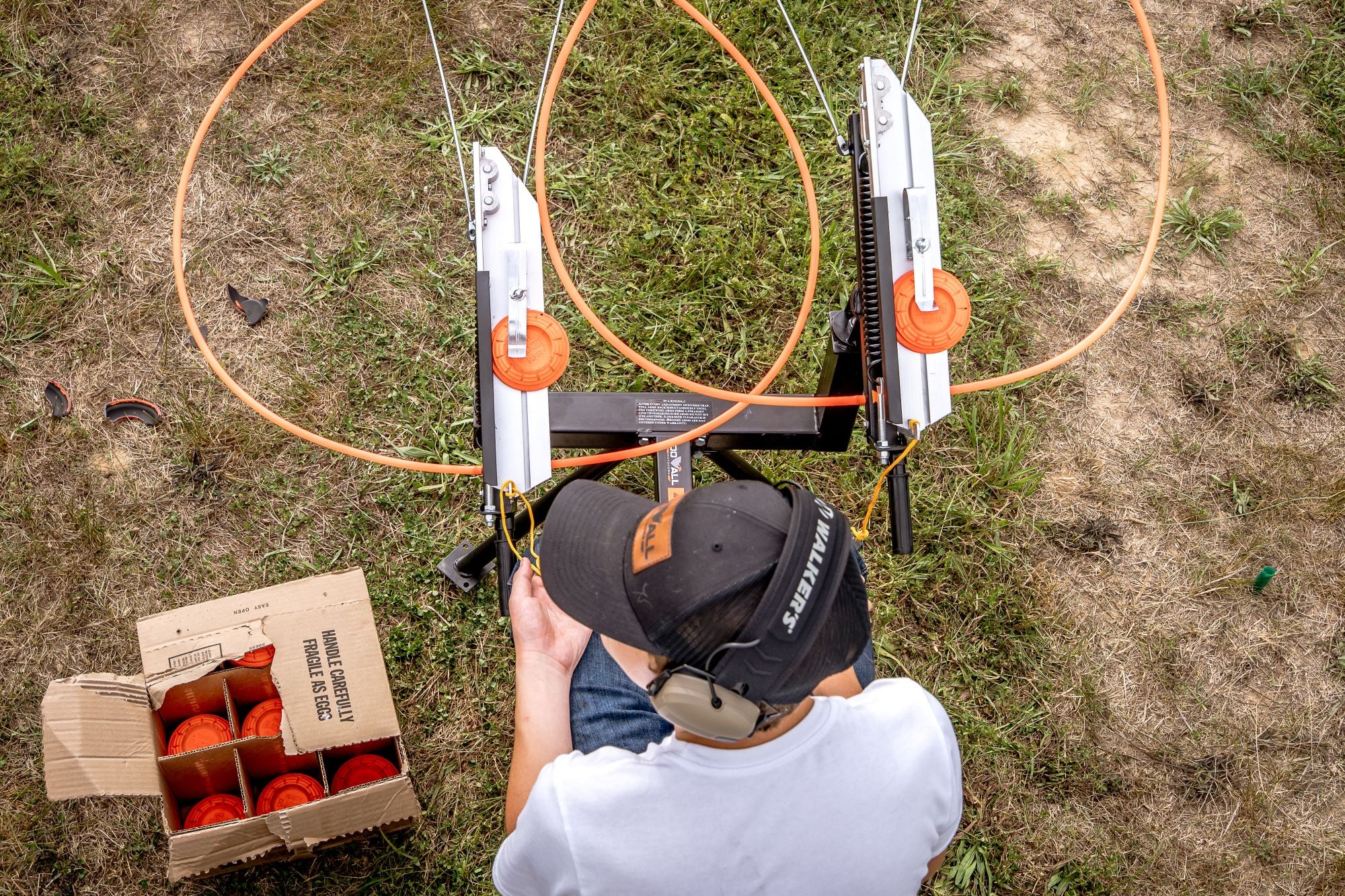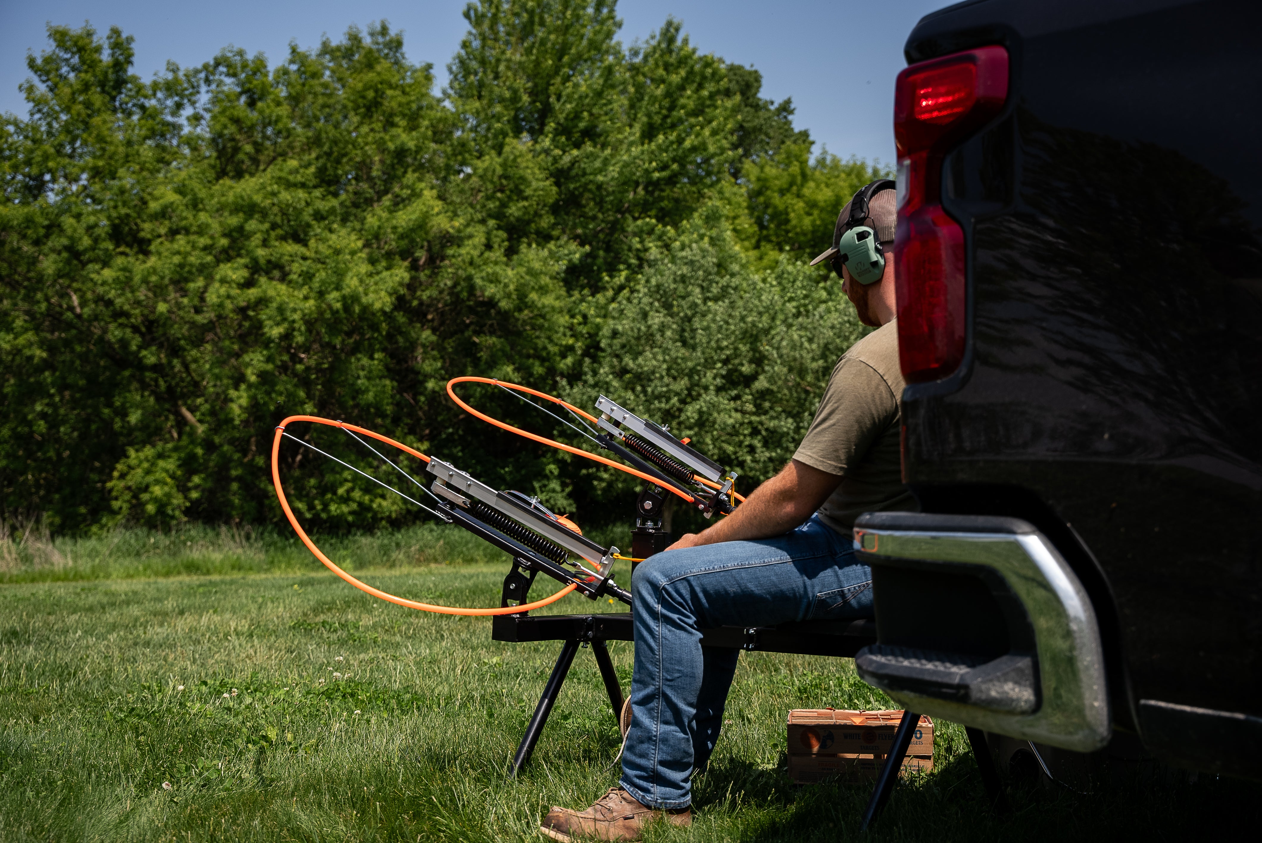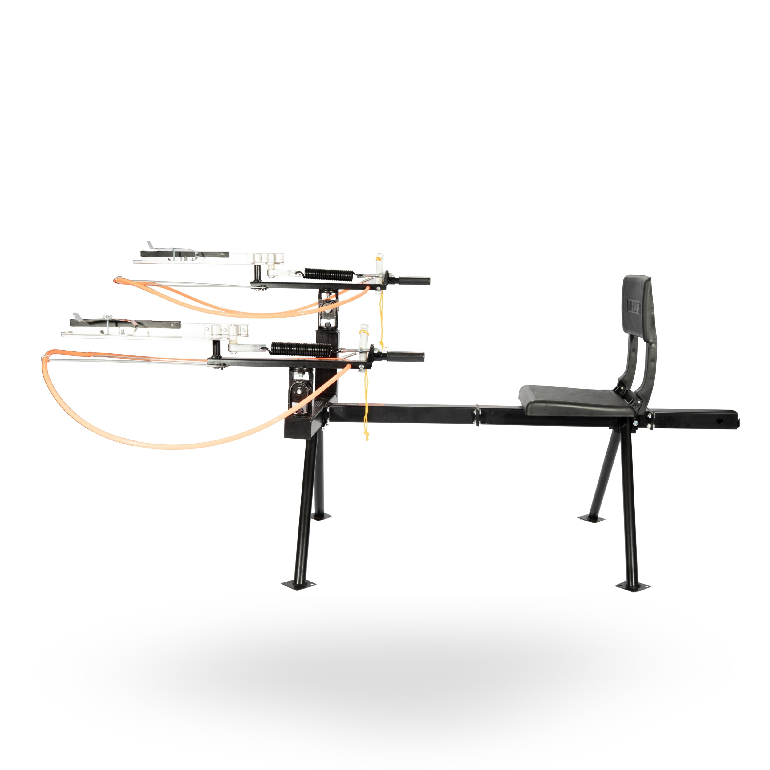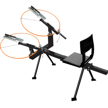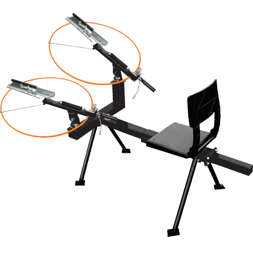 The DOUBLE-HEAD FULL COCK TRAP incorporates the same features as the Single Trap, but with an extra throwing arm that allows it to throw report pairs, in addition to the full Do-All target range. This model can launch four targets simultaneously, making it a top choice for team events and other challenging clay target games. Because of their solid, reliable construction, Do-ALL Traps are used at top sporting clays courses, trap clubs, and shooting ranges. A three-pivot mount lets you throw any targets (rabbits and birds), as singles or stacked doubles, in all directions, and at any angle. They’ll throw singles up to 80 yards and stacked doubles up to 60 yards, and a sliding adjustable clip permits easy changing of speed and direction. Cocking is easy, which, combined with the comfortable fold-down seat, makes even long hours of throwing fun. Setting the arm on any of the full-cocks is easy because the frames put your body in the right position. The positive-locking trigger is safe and quick. And, since they’re made of aluminum and cast steel tubing, they’ll last for years. Assembles in minutes, and comes complete with adjusting wrench.